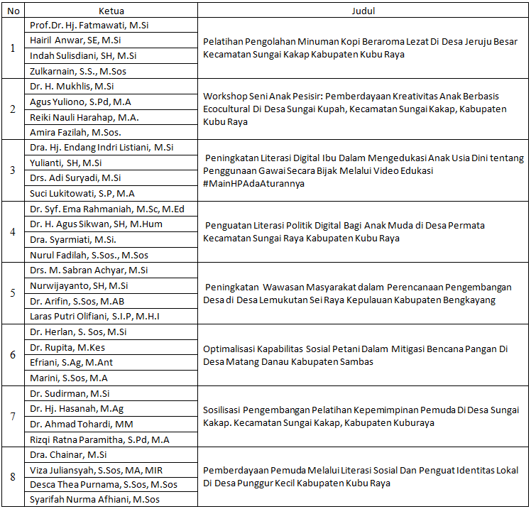 Kegiatan Pengabdian kepada Masyarakat (PkM) merupakan salah satu pilar utama tridarma perguruan tinggi yang dilaksanakan oleh dosen Fakultas Ilmu Sosial dan Ilmu Politik Universitas Tanjungpura. Melalui kegiatan ini, dosen berperan aktif dalam mentransfer pengetahuan, hasil penelitian, dan keahlian akademik untuk menjawab berbagai kebutuhan serta tantangan sosial yang dihadapi masyarakat, baik di tingkat lokal maupun regional. Dosen FISIP Universitas Tanjungpura secara berkelanjutan melaksanakan kegiatan pengabdian dengan pendekatan berbasis riset (research based community service) yang relevan dengan bidang keilmuan sosial dan politik. Kegiatan tersebut mencakup peningkatan kapasitas masyarakat, pendampingan tata kelola pemerintahan daerah, penguatan literasi digital dan sosial, advokasi kebijakan publik, serta pemberdayaan masyarakat di wilayah perbatasan, pesisir, dan perkotaan. Pelaksanaan PkM didukung oleh sistem penjaminan mutu internal fakultas dan universitas, serta diarahkan untuk memperkuat keterkaitan antara pendidikan, penelitian, dan praktik sosial. Dengan demikian, kegiatan pengabdian dosen FISIP tidak hanya berfungsi sebagai implementasi ilmu pengetahuan, tetapi juga sebagai wujud tanggung jawab sosial akademisi dalam mendukung pembangunan masyarakat yang inklusif, partisipatif, dan berkelanjutan.